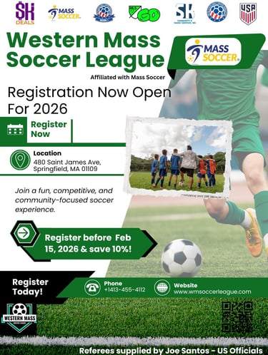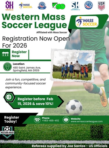 Western Mass Soccer League (WMSL) is an officially affiliated league under Mass Soccer, USASA, and MLS GO, created to provide a competitive, organized, and community-driven soccer experience in Western Massachusetts.
